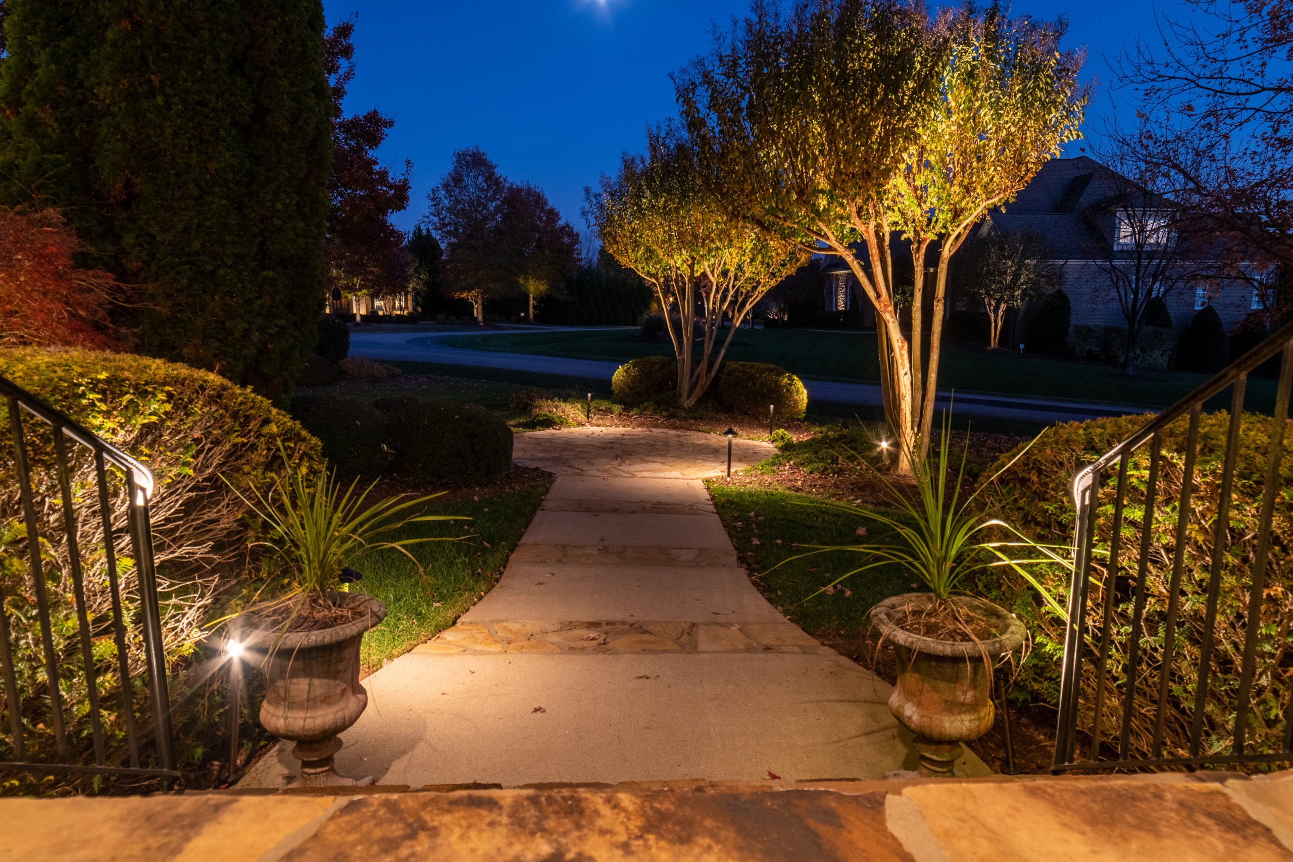 If you prefer a more structured look, We can use path lighting to guide guests through your yard, or uplighting to highlight architectural features. The key is to find the right balance between natural and architectural elements, creating a cohesive look that complements your home and landscape.